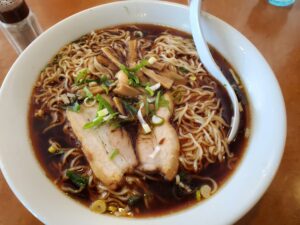 スープは黒いしょゆベースで、麺は細麺の縮麺、自家製焼き豚、