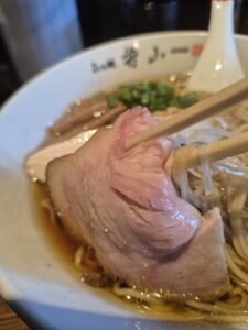 トッピングには、豚肩ロースと鶏ムネ肉の2種類のチャーシューが乗っています。どちらも真空低温調理されており、豚肉は生ハムのようなしっとり感、鶏肉はパサつき皆無のサクッとした歯切れの良さが特徴です。スープの熱で火が通り過ぎないよう、早めにいただくのがポイントです。